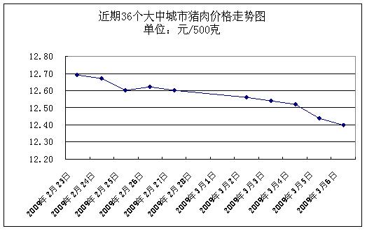 中新网3月9日电 据国家发改委网站消息,据国家发展改革委价格监测中心监测,上周(2009.3.2-2009.3.6,下同)全国36个大中城市集市、超市猪肉(精瘦肉)平均零售价格每500克为12.49元,与前一周(2009.2.23-2009.2.27,下同)相比下降1.19%。