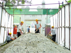 昨天上午,笔者在日坛公园的施工现场看到,作为日坛的核心建筑,整个圆坛被一层厚厚的围挡围住,透过围挡能看到圆坛上的水泥地砖全部被刨出,墙上破损的琉璃瓦也已拆下。“日坛中心的圆坛最初铺设的是红色琉璃,意为太阳的颜色,直至清代才改为青砖。”董亮表示,此次修缮前,工作人员原本想为圆坛恢复明代红色琉璃地面,但是走访门头沟琉璃渠和景德镇的琉璃烧制场之后,得知烧红琉璃的配方已经失传,“最终我们决定还是改为清代的青砖地面”。