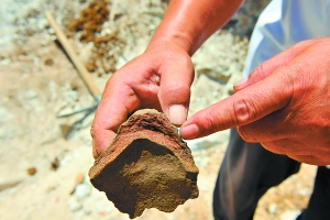 前天一大早,王学纪和工人们来到山上,想趁天气还不太热尽量多挖些。工人们挥锹抡镐之时,常常会碰到石块之类的硬物,从不会在意。这次也不例外,在地下沉睡了几千年的文物碎片,被工人们的铁锹连同土块一齐甩到坑外。幸好,王学纪当时正站在坑边观察坑面与山坡的角度,一个带有独特花纹的“土块”忽然滚落到脚边,引起了他的注意。