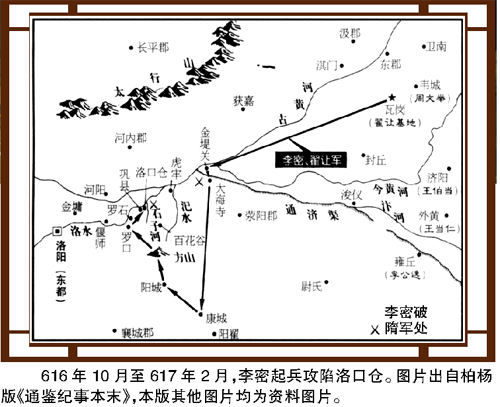李密当时也被捕,但机智的他逃脱了。公元616年,当远在山西太原的李渊还在犹豫着要不要起事的时候,李密认识了王伯当,王伯当把他介绍给了瓦岗军头领翟让。李密投靠了瓦岗军这家大公司,并交出漂亮的业务单:616年10月27日,李密精心设计大海寺伏击战,击杀隋朝名将张须陀。凭这张业务单,李密渐渐掌握了瓦岗军这家公司。有了资本,有了业绩,李密下一步剑指何方?居然还是洛阳!