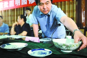 在修复完成的瓷器中,一件“五蝠捧寿”青花盘引起了国家文物局科技保护专家组组长王丹华的注意,这件破损瓷器上五只蝙蝠中的两只是在修复过程中后期补绘上的,王丹华对此不赞同。