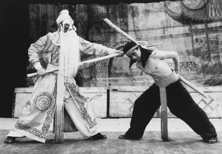 濮阳地处黄河故道,沙碱河坡响马出没,自古民风剽悍。一马平川的河滩里,戏台一扎,锣鼓家伙响遏行云,远近乡民循声而至,很快台下挤挨不动了。台上,《三岔口》、《两郎山》、《群英会》、《闹天宫》等武戏火爆已极,弦子唢呐呜哇鸣奏,三两武生一溜筋斗翻动,扎大靠武将闪亮亮相,一个凌空劈叉,一声高亢叫板,老有劲了。