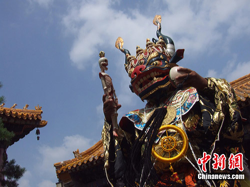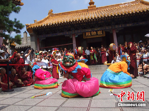 中新网五台山7月26日电 (高峰毅 焦瑾琦)26日上午,山西五台山最大黄庙菩萨顶举行传统的奉旨道场法会中的重要活动:藏舞——跳鬼。