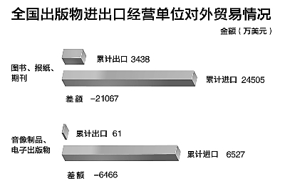 在对外贸易方面,传统出版物(图书、报纸、期刊、音像制品、电子出版物)和版权的进出口贸易在总体数量和金额上仍存在着逆差,2009年,传统出版物贸易逆差为1946.1万册(份、张、盒)、2.8亿美元,相当于同期进出口总量的52.9%和总金额的79.7%;引进版权品种数量是输出数量的3.3倍。