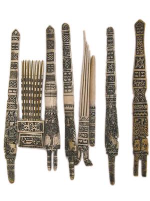 第二道工序是用锋利的凿子或刻刀把人头像及各种花纹图案镂刻在骨条上,这些花纹图案不用预先画模,而是雕刻者根据自己对图案的构思和理解直接刻上去的,刻完后涂上一层黑烟或深蓝色的植物(大青叶)液浆为颜料,使之浸入刻痕中,再打上蜂蜡固定。