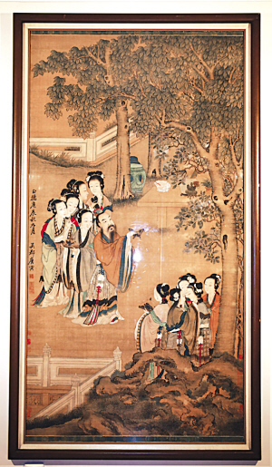 居住在法国巴黎的法籍华人曹先生藏有一幅明代唐寅的绢画。此画高近200厘米,宽100厘米。画中一位贵人和10个仕女,在春光明媚的花园里戏蝶。园内梨花似雪,空中蛱蝶飞舞,贵人神态不俗。画的落款是:吴郡唐寅。下面盖有“南京解元”印章。作画的时间是:正德庚辰(1520年)秋九月。此外,画上还有好多位收藏者盖的印章。在苦苦揭秘这幅名画过程中,收藏者在万里之外偶然发现唐寅一首藏诗,与名画可谓绝配。经查,此诗竟来源于丹阳孙氏家谱。