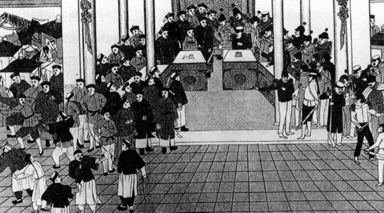 1860年10月24至25日,《北京条约》签订仪式。由皇帝的叔叔恭亲王、英国代表额尔金、法国钦差噶罗男爵签订。这是中国的佚名画(现藏尚蒂伊喷泉图书馆)。