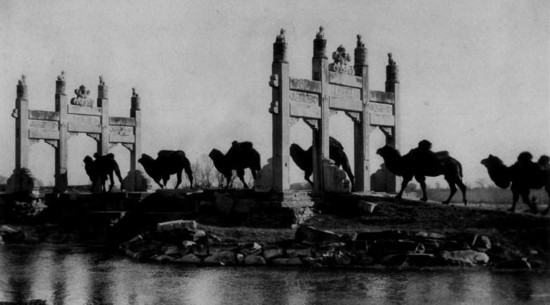 骆驼队穿过石碑坊。20世纪20年代拍摄,德国汉茨·冯·佩克哈墨尔摄影。