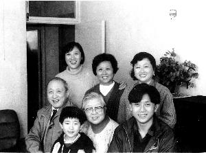 与女儿、外孙在一起。前排左起:黄宗江、外孙叶涵、阮若珊、外孙吕男。后排左起:三女儿阮丹青、大女阮丹妮、二女儿阮丹娣。