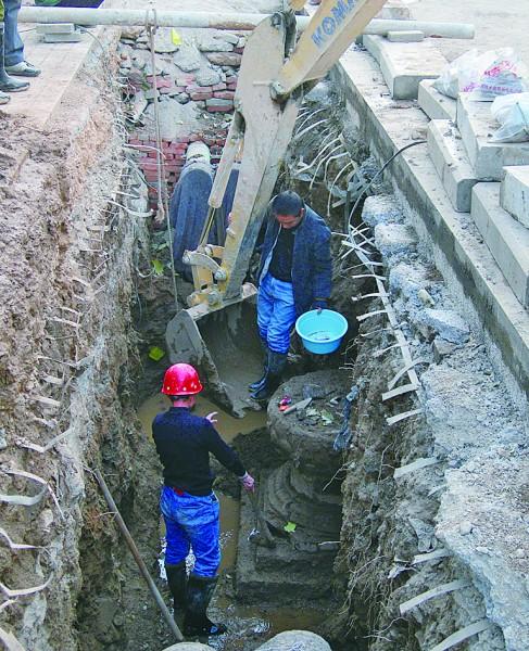“经幢上有雕刻的佛教人物图像,快给我相机拍几张照片!”下午3点半左右,站在施工沟里面清理经幢的济南市考古研究所高继习科长突然向地面上的同事呼喊,地面上的考古人员立即递下去一个相机。当记者拿出自己的相机,也想让高科长代为拍摄几张照片时,他委婉地拒绝了记者的请求。但他告诉记者,目前他只看到经幢上雕刻有佛教人物图像,并没有看到文字。