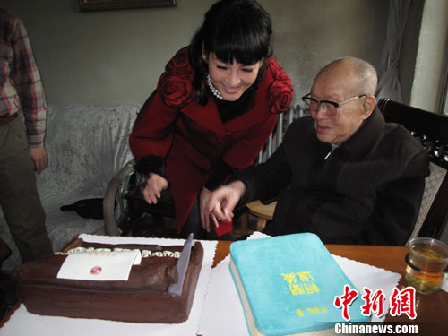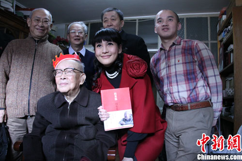 上个月,周有光刚刚获得了由中华文化促进会、南京市人民政府、凤凰卫视主办的“智慧东方——2010中华文化人物”称号。12日上午,中华文化促进会常务副主席王石及凤凰卫视著名节目主持人沈星一行来到周有光家为他祝寿。
