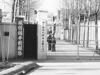 3月3日下午,商丘市中兴印务有限公司门口一侧的对联“诚信铺平前程路”清晰可见。画面中的两人在记者拍摄照片后,以记者“偷拍”为由报警,并拦住记者搭乘的车不让离开。 本报记者 来 扬摄