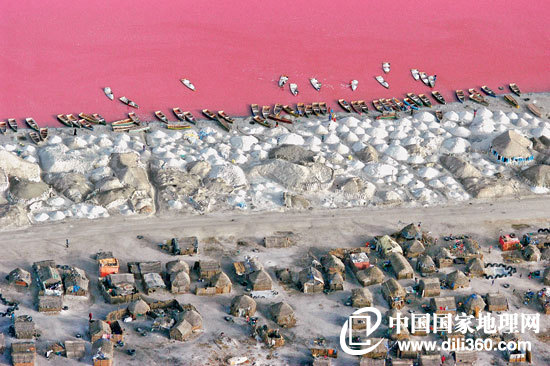 图为从空中俯瞰玫瑰湖畔堆成小山一样的盐。白盐山和红盐湖的交界处,是当地雷布人的采盐船。玫瑰湖的湖水每升含盐量高达380克,从20世纪70年代起,玫瑰湖生产的盐开始进入市场,并成为塞内加尔渔业生产不可缺少的原料。