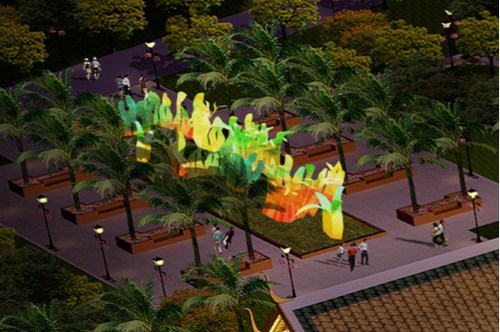 美籍华裔女雕塑家盛姗姗设计创作的巨型玻璃公共艺术雕塑,以意大利千年传统玻璃工艺,在威尼斯手工制作完成。整个雕塑规模宏大,在白天和夜晚将展现不同的色彩,随着游人目光和位置移动,可体验玻璃雕塑形态和色彩的千变万化。
