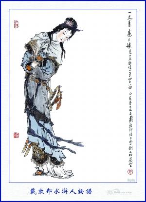 这是扈三娘上山第一功。后来像第六十三回扈三娘作为主要将领,迎战北京大名府两大将之一的李成。这里描写她:有天然标格,玉手纤纤,双持宝刀,恁英雄煊赫。眼溜秋波,万种妖娆堪摘。写尽了扈三娘的英勇美貌。当然小说中也不忘再调侃一句,她虽然英勇美貌,左有顾大嫂,右有孙二娘,是一个强烈的反衬。在攻打北京大名府的时候,朝廷又调来关胜,关胜手下有两将,其中的一将郝思文也在一百八将之数。在小说里面的第六十四回,扈三娘就如同当年擒拿彭玘一样,如法炮制,故技重施,撒出她的红绵套索,一个回合就把关胜的副将郝思文活捉。