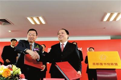 首都图书馆和国家图书馆的负责人在成立仪式上签约。本报记者蒲东峰摄