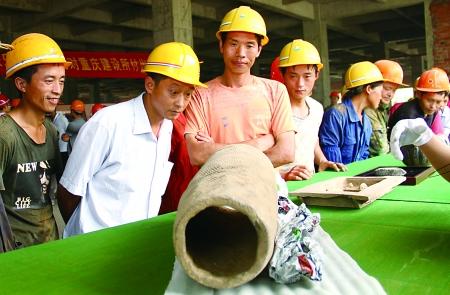 昨日上午,在大渡口区建桥工业园西江建筑工地,10多个工人对着一节陶管纳闷。