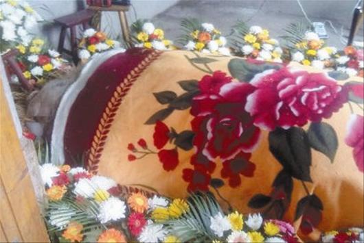 很快,猪王离世的消息传出寺院。6月28日下午,当地村民齐聚莲峰禅寺,寺里师傅在给猪王诵经超度。10多名村民自发地帮猪王擦洗身体,并用冰块敷身,以防在高温天气里腐烂发臭。村民们在猪王四周摆放上鲜花,身上盖着厚厚的毛毯,送别猪王。