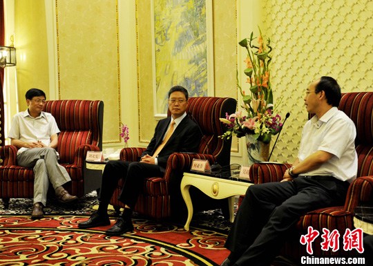 12日上午,四川省委宣传部部长吴靖平(右)在成都会见了国务院侨务办公室副主任何亚非(中)、中国新闻社社长刘北宪(左)一行。安源 摄