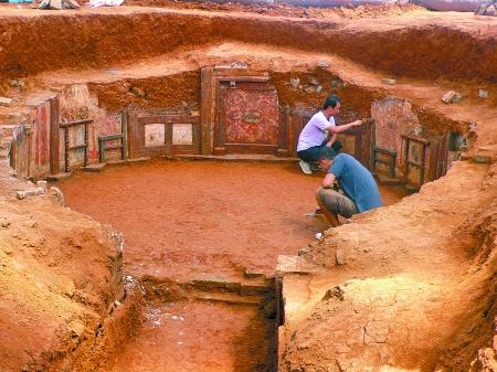 考古人员正在清理壁画墓,该墓的墓室为近圆形。