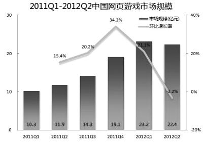 易观国际近日发布分析报告显示,2012年第二季度中国网页游戏市场规模为22.4亿元,相比今年第一季度环比下降3.2%。