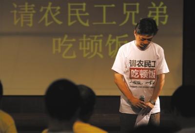“请农民工吃顿饭”公益活动发起人、北京师范大学中国公益研究院院长王振耀非常支持小崔的这次请吃饭活动,他在现场呼吁大家应该对农民工群体有更多的尊重和理解。临下台前,王振耀还出了个主意,让农民工记得找小崔合张影,这是“小崔曾请我吃过饭”的“证据”。这个建议马上得到响应,农民工兄弟吃了饭后排队找崔永元签名合影。