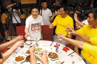 敬酒 崔永元和农民工兄弟们同桌吃饭并向他们敬酒。