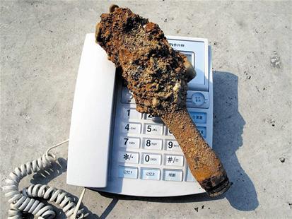 昨日上午,该镇张程村河沙厂的村民从府河取沙时,在河沙中发现一枚近30厘米长的棒状物体(如图)。当好奇者拧开锈迹斑驳的“棒棒”底部的一个铁盖时,赫然发现其内藏有环状尼龙拉线——这是一枚手榴弹!