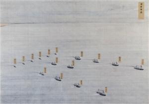 甲午阅操历时18天,共调集了南北洋21艘军舰,是大清海军空前的海上军演。兹事体大,留下了清宫画工所绘的这套《渤海阅师图》,十幅图依次命名为:《庙岛蜃市》、《阅师纪程》、《之罘形势》、《威海水道》、《威海船操》、《旅顺水操》、《海军布阵》、《兵船悬彩》、《烟台大会》、《登州振旅》。册页再现了那一次海上大阅操,也显露出北洋水师的滑而不实。
