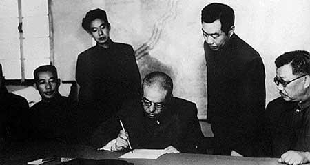彭德怀在朝鲜停战协议上签字(资料图)