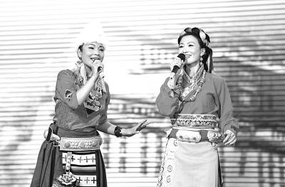 藏族青年歌手扎西拉宗(右)、金珠卓玛在雪顿文化节期间演唱歌曲《深情的弦子》。 新华社记者 徐亮摄