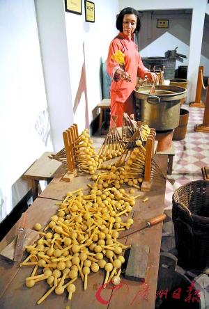 打开百年雕花大门,绕过广绣屏风进入大厅,时光仿佛倒流百年。大厅正面一个药台,内有“掌柜”和“伙计”在药柜前“执药”。一旁的“坐堂医师”正准备为“病人”把脉……蒸药、舂药、药材出仓、炮制药材……每一个步骤都浓缩了制药过程的仔细与艰辛。博物馆馆长黄一文介绍,这些栩栩如生的人物,全部根据真人的神态制造,个个有原型,而且全部用高分子聚酯做成,身材、肤色均十分逼真。