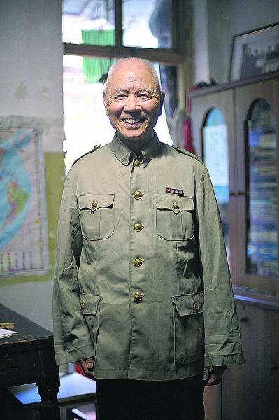 90岁的老海关甘胜禄身着捐赠的海关关服。记者彭年 摄