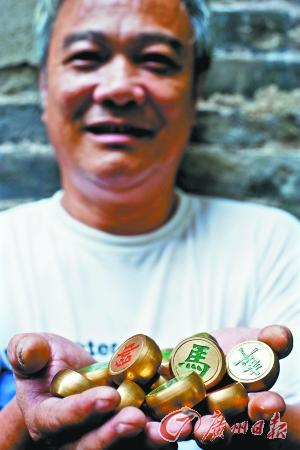 每粒棋子重2两4,被打磨得光滑,加上一个可以折叠的铜棋盘,整副棋重达18.5斤……61岁的残疾退休钳工曾庆材向记者展示这副花了22天制成的作品,他说:“以前也有人用黄铜做过象棋,但是棋盘可以合起来,将棋子放进去的,我在广州还没有见别人做过。”