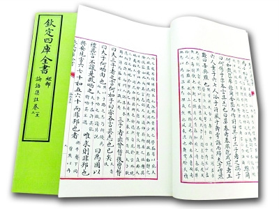 昨天,专家们仔细观摩了原大原色原样出版的《四库全书》样书,共8函58册。在评审现场,一批样书摊放在书桌上。《四库全书》分经史子集四部,依春夏秋冬四季分色装帧,封面分别为绿红蓝灰四色,而《四库全书总目》是全书纲领,因而选用皇家专用的黄色。翻开样书,字体庄重优雅,正文同样有黑红绿蓝四色,皇帝的眉批则使用淡淡的鹅黄色,观之赏心悦目。