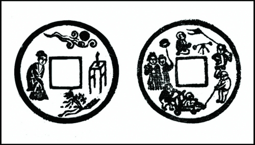 一枚是一女子在焚香拜月,小小香几上,一炷香已经燃烧过半;月儿在薄云中忽隐忽现,静中有动;背面是五男二女,各执玩具玩耍。另一枚面有亭台,庭院设香几,上有燃香,空中彩云拱月。背一妇人及八个婴孩儿,有的绕膝嬉戏,有的在摆弄各种玩具。两枚钱都描写了中秋时节天下太平的祥和气象,生活气氛浓郁。
