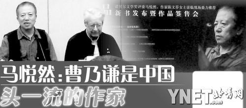 “马悦然说,曹乃谦和李锐、莫言是有希望获得诺贝尔文学奖的作家。”这是一句在中国流传甚广的说法,作为诺贝尔文学奖18位终身评委之一、也是评委中唯一深谙中国文化的瑞典汉学家,马悦然昨天在上海出席曹乃谦作品发布会。马悦然夫人陈文芬特别澄清:此说系误传,“马悦然想说的是,曹乃谦就像中国头一流的作家李锐、莫言、苏童、韩少功等等,都是值得世界关注的作家。”