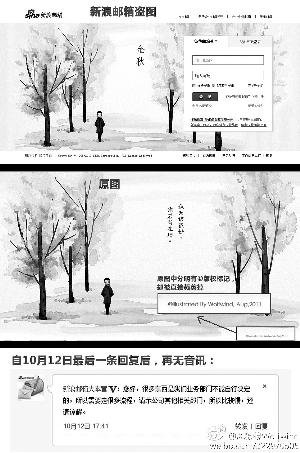 今年10月8日,“小狼”接到同学提醒,说自己原创的那张照片被新浪盗取,并用在邮箱主页(如图)。“我赶紧上网,发现还真是我的那张图。当时原图中央引用了歌词‘秋天该很好,你若尚在场’,被新浪改成了‘金秋’二字。另外图片下方的版权标志‘ ’(意为Copyright Reserved)和作者信息被剪裁掉。”“小狼”告诉记者说。