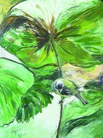 《独自悠闲》是李菲秉承中国传统山水、花鸟画的意境和形式结构,与油画创作方法相结合的一幅力作。构图借鉴了传统国画手法:夏荷满池,绿叶田田,莲茎上停着一鸟,独自憩息享悠闲。荷叶之实,池水之虚,小鸟目不转睛的悠闲神态,令人回味无穷。李菲就是这样对待传统文化及国画样式进行 “暧昧化、虚化、抽象化”处理,从而表现她“每天都用心地走在影视和油画艺术的故事里”那种特有的生活体味、感情气质和艺术意象。我想,这只小鸟,抑或正是李菲在影视的池塘里,停在莲茎上“独自悠闲”的自我写照吧!?