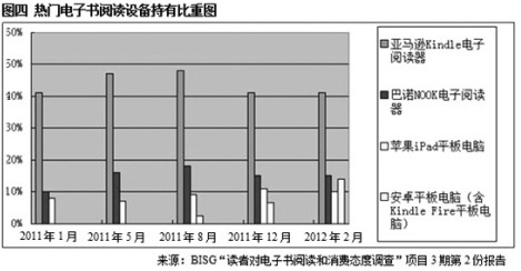 这次平板电脑热潮多半是由亚马逊去年推出的新产品Kindle Fire带动的。这款产品从年初投放市场就表现不俗,现有17%的电子出版物读者持有此款阅读设备。其他安卓产品,如巴诺NOOK也成为一线产品。此外,苹果平板电脑表现一向稳健,2011年8月从2%的读者持有率到2012年8月增长到7%,目前稳定在10%。