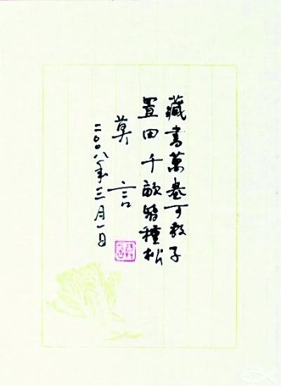 韩斗说:“莫言的扇面和对联作品都来自我的一位朋友,2008年莫言参加了一次文学研讨会,刚好我这位朋友是大会的工作人员,他很崇敬莫言,也喜欢他的书法,于是就向他求几幅墨宝,莫言也欣然同意,所以就在不大的信纸上顺手写下这几幅字。”