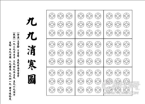 九九消寒图最早可以追溯到元代。九九消寒图一般有三种形式:铜钱型、梅花型、文字型。