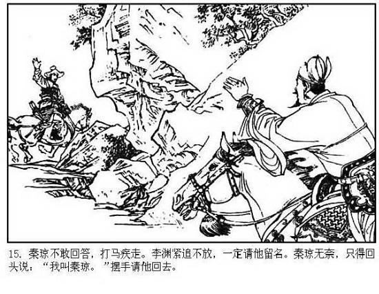 秦琼不敢回答,打马疾走。李渊紧追不放,一定请他留名。秦琼无奈,只得回头说:“我叫秦琼。”摆手请他回去。(李渊只听得个“琼五爷”)