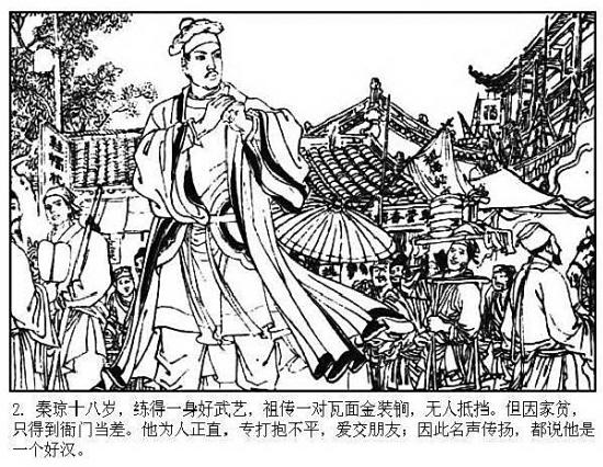 秦琼十八岁,练得一身好武艺,祖传一对瓦面金装锏,无人抵挡。但因家贫,只得到衙门当差。他为人正直,专打抱不平,爱交朋友;因此名声传扬,都说他是一个好汉。