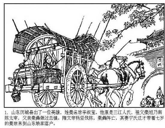 山东历城县出了一位英雄,姓秦名琼字叔宝。他原是三江人氏,祖父秦旭乃南陈太宰,父亲秦彝做过总镇。隋文帝杨坚伐陈,秦彝阵亡,其妻宁氏这才带着七岁的秦琼来到山东娘家落户。