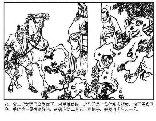 金三马黄骠马牵到廊下,对单雄信说,此马乃是一位落难人所卖,为了需钱回乡。单雄信一见确是好马,就答应给二百五十两银子,并要请卖马人一见。