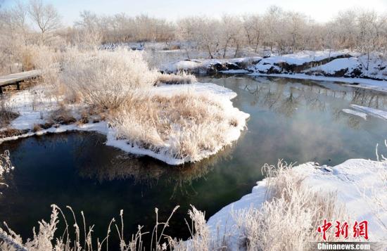 11月22日,五大连池风景区冬季温泊美景如画。霜花和云雾将温泊装扮得如梦境一般。在阳光照耀下,岸边美丽的雪景倒映在波光粼粼的湖面上。水面缭绕的雾气与水底变幻的景色为温泊披上了一层神秘的色彩。中新社发 邱齐龙 摄 图片来源:CNSPHOTO