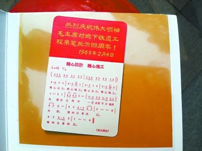 (记者佘晖)昨日,武汉地铁通讯专家章辉晒出“中国地铁第一票”——1969年10月1日北京地铁建成通车时的纪念票。红白两色的票身正面,是一张毛泽东办公的照片、1965年毛泽东对修建北京地铁的批示手迹,背面印有著名作曲家劫夫谱曲的地铁歌。