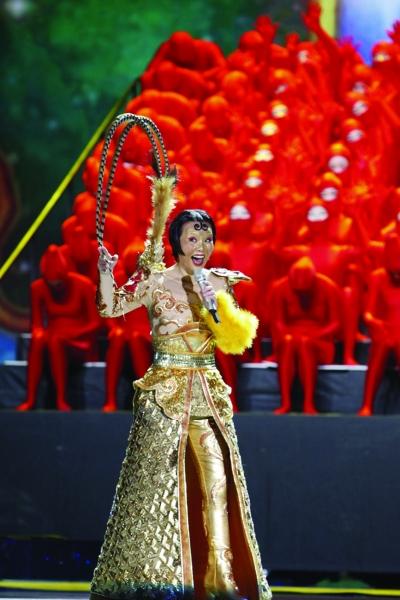 在今年湖南卫视跨年已经带来《法海你不懂爱》的龚琳娜,在小年夜晚会上又唱响新作《金箍棒》。除了邀外国老公扮唐僧,一边诵经,一边唱起了《Only You》。龚琳娜版的孙悟空造型更是惊人,她身着黄金甲,头发紧紧贴住脑袋画成猴头,金眉毛,红眼影,额头上顶着金箍,半只手臂覆盖着厚厚的黄毛,齐天大圣头顶的凤翅紫金冠则被她镶在了肩膀上。除了龚琳娜,就连伴奏乐团也全是“牛鬼蛇神”,观音弹琴,八戒拉二胡,牛魔王打鼓。