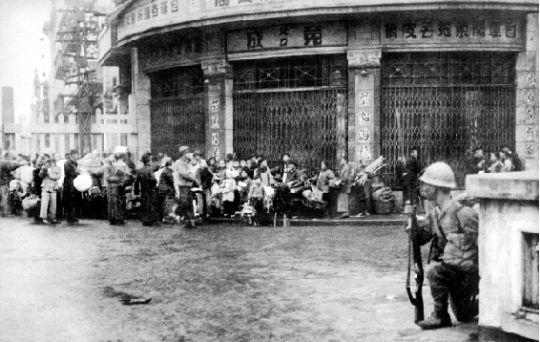 武汉陷落后,日军第6师团佐野支队士兵戒备着汉口街头的中国难民。江汉大学武汉抗战研究中心供图